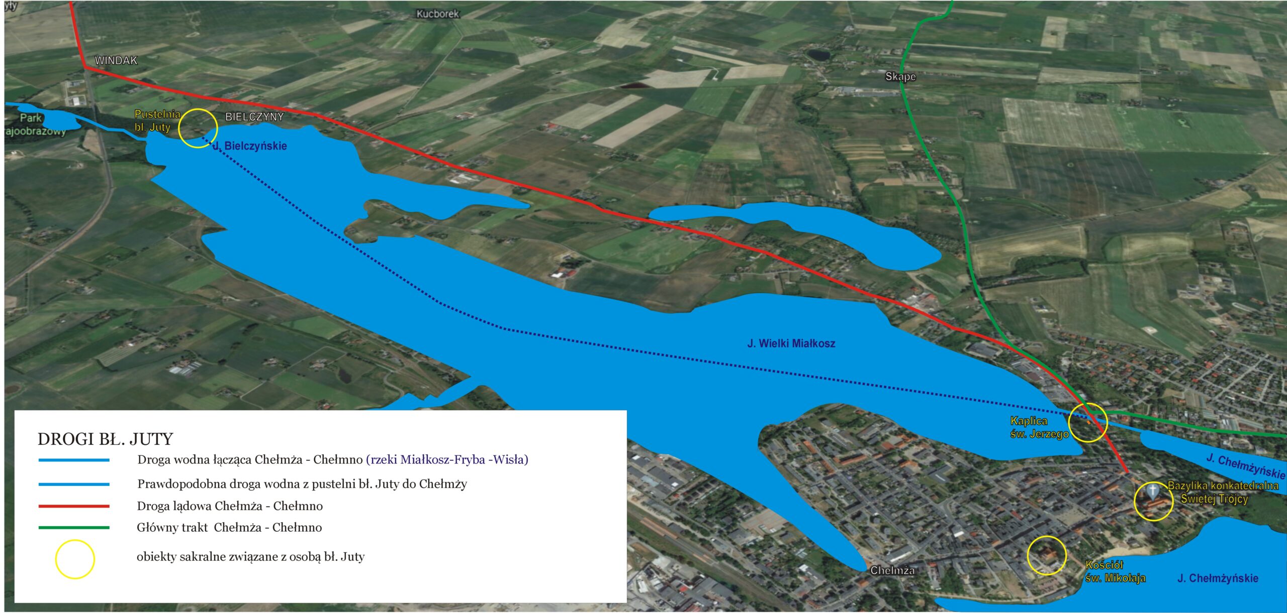 W średniowieczu istniała droga wodna pomiędzy Chełmżą, a Bielczynami (Jezioro Chełmżyńskie – Jezioro Wielki Miałkosz – Jezioro Biełczyńskie). Kaplica św. Jerzego była przy tej drodze wodnej (dobry punkt nawigacyjny), więc możliwe, że Juta wykorzystywała łódź jako środek komunikacyjny i transportowy.