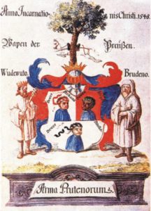 Niewiele wiadomo o dawnym herbie Prusów, o herbach ziem pruskich, a nawet herbach poszczególnych rodów pruskich, niektórzy historycy nawet uważają, że Prusowie herbów nie posiadali. Tu przedstawiony został herb Prusów, gdzie na trójdzielnej tarczy herbowej pojawia się trójca bogów pruskich: Perkuno, Potrimpo i Patollo, obok tarczy bracia z lewej Brudeno Kapłan Prus, z prawej w koronie i berłem Król Prus Wudewuto. Klejnot herbu (figura nad koroną) to dwa najważniejsze symbole Perkuna najważniejszego boga pruskiego: dąb i koń. Klejnot tego herbu należałoby traktować jako wspólny symbol – herb dawnych Prusów.