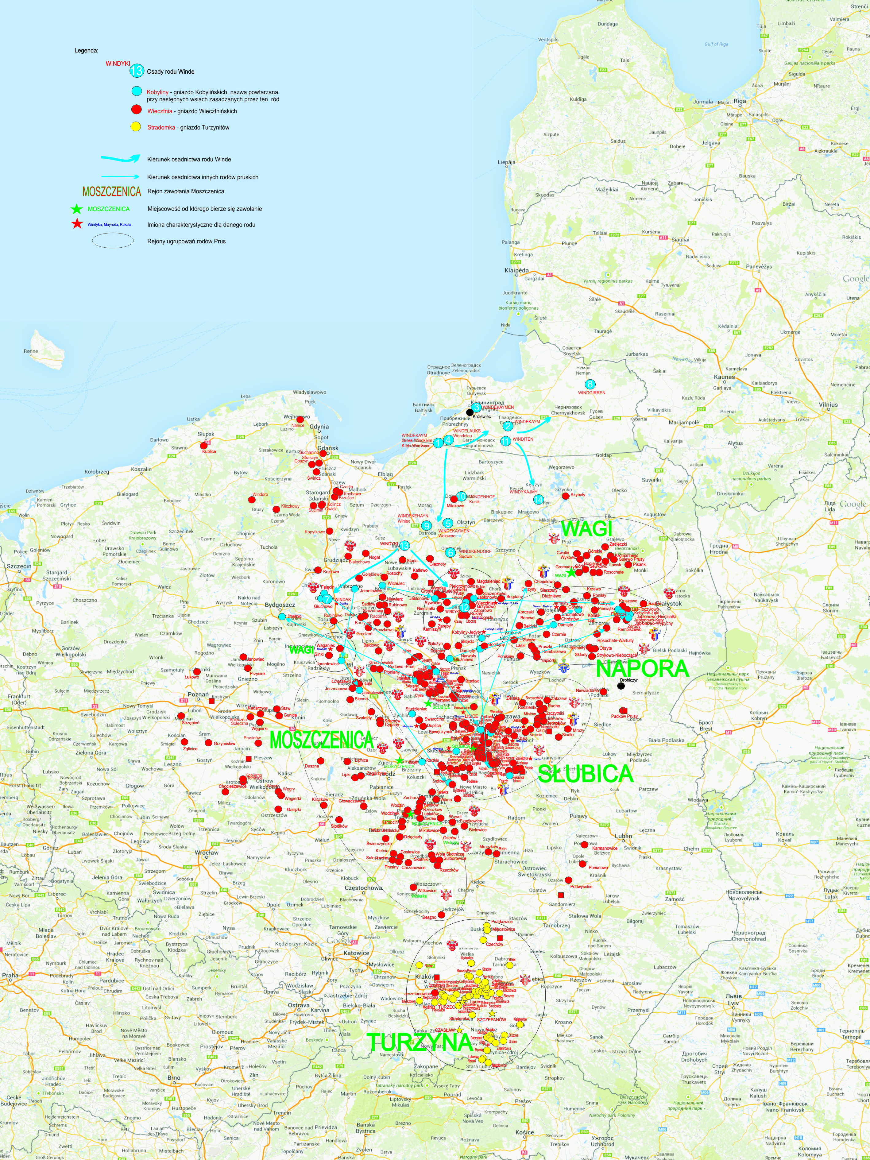 Na mapie przedstawiono czerwonym kolorem miejscowości w którym przebywała ludność pochodzenia pruskiego; czerwone kółka oznaczają tzw. gniazda rodowe Prusów, czerwone kwadraty to istniejące miejscowości o nazwie Prusy. Żółte kółka to gniazda rodowe Turzynitów, którzy są rodowcami herbu Prus, lecz prawdopodobnie nie są pochodzenia pruskiego[5]. Na podstawie rozejścia imion charakterystycznych w rodach PRUS i występujących w dokumentach tj. Obizor, Windyka, Rukała określono prawdopodobną drogę osadnictwa pruskiego w Polsce. Najwcześniejszymi pruskimi osadnikami były osoby brane w niewolę przez rycerstwo polskie podczas rejz władców piastowskich na ziemie pruskie. W wyniku takich napadów, rozbojów i sprowadzenia siłą pozostałych przy życiu mieszkańców Prus powstało ponad sto książęcych wsi służebnych. Ten proceder przyczynił się do wyludnienia Sasini, Galindii, Ziemi Lubawskiej i zdobycia Ziemi Chełmińskiej. Ta przemoc ze strony Polski wobec plemion pruskich spowodowała reakcję Prusów i Jaćwingów powodując napady rabunkowe i niszczycielskie na tereny polskie. Rycerstwo polskie nie było w stanie obronić granic księstw polskich przed rycerstwem pruskim i jaćwieskim. Książęta piastowscy zadecydowali o sprowadzeniu krzyżaków. Początkowo Polacy współdziałali z krzyżakami przy podboju Ziemi Chełmińskiej i Pomezanii, później pomagali im krzyżowcy z innych krajów zwłaszcza z Niemiec i Czech. Bezwzględny terror, mordy i pacyfikacje powodują ucieczkę Prusów ze swej ojczyzny, a późniejsze powstania pruskie i ich zdławienie powiększają fale emigracji. Polska i krzyżacy to wrogowie Prusów, ale Polska jest dla Prusów bardziej „ludzka” i próbują osiedlić się na jej terenach przygranicznych. Obizor i jego syn Windyka to przedstawiciele rodu pruskich możnych, którzy osiedli na pograniczu prusko-polskim w rejonie Mławy. Prawdopodobnie przybyli z grodu (kaymu) Windyki k. Iławy i założyli Windyki k. Mławy. Dowodem na to jest pojawienie się w dokumentach archiwalnych imion Obizora i Windyki w rodach pruskich zasiedziałych w Windykach, Grzybowie i Wieczfni. Obizor wyruszył ze swego kaymu jeszcze za czasów powstań pruskich, zapewne swym mieczem naraził się najeźdźcy spod znaku czarnego krzyża. Miejsce osadnictwa to pogranicze, skąd łatwo wrócić do swoich, jednak rzeczywistość nie jest łatwa i trzeba służyć księciu polskiemu. Za swą pracę i ze względu na swą pozycję społeczną otrzymał przywilej dla siebie i swych synów Windyka i Letauda.